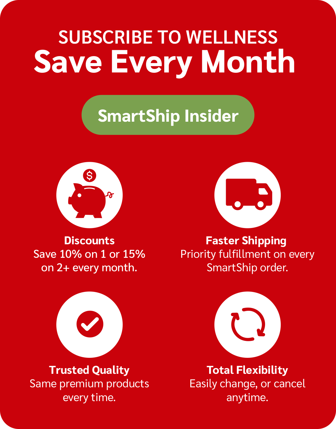 Set it and forget it—your favorite products arrive automatically, on your schedule. Plus, every SmartShip order comes with exclusive savings, making wellness effortless and affordable.
